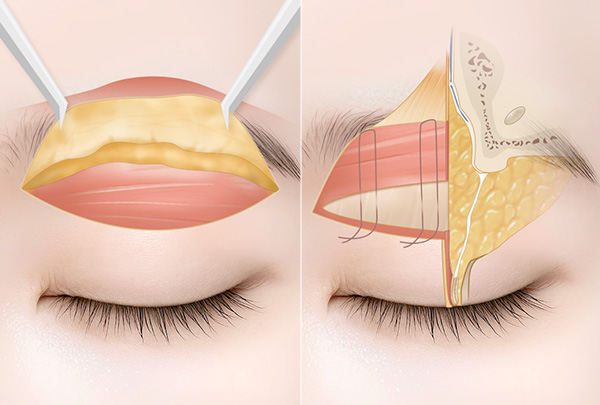 단순히 피부만 잘라내는 방식은 쉽지만 금방 처질 수 있습니다. 따라서 눈의 SMAS 층을 이마의 SMAS 층으로 당겨 고정하는 방식으로 유지력과 리프팅효과를 증대시킬 수 있습니다.