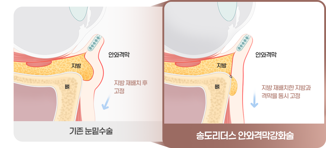 맞춤 디자인지방량, 꺼짐 범위, 안구 돌출/함몰 정도, 피부 상태를 정밀하게 진단해 개인별로 최적화된 재배치 방법을 적용합니다.