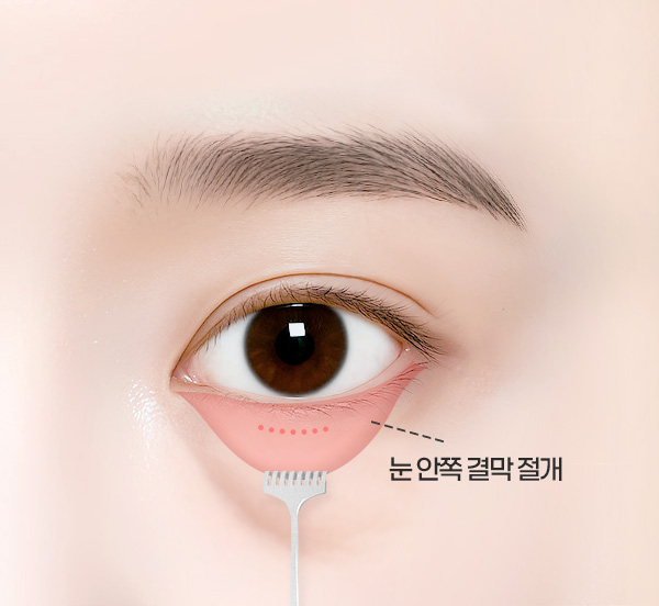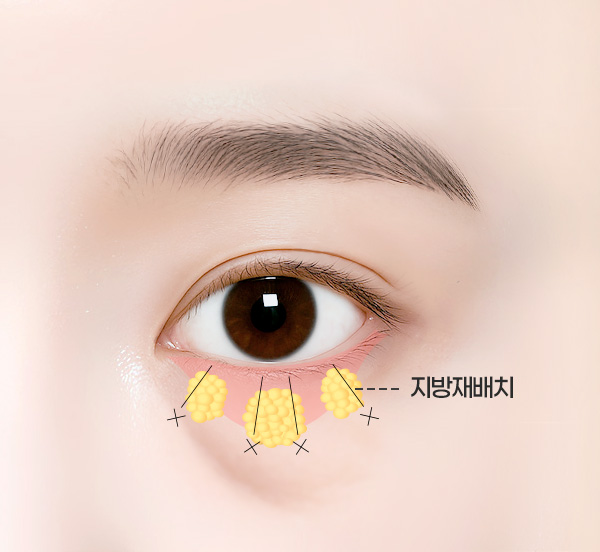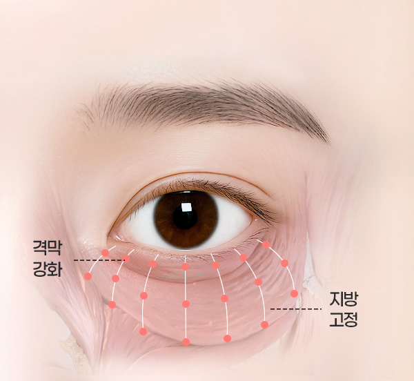 우리는 그 골격을 보강하기 위하여 과도한 눈밑의 지방을 골격 위로 이동시켜 불룩한 부위는 가볍게, 꺼진 부위는 차오르게 합니다.